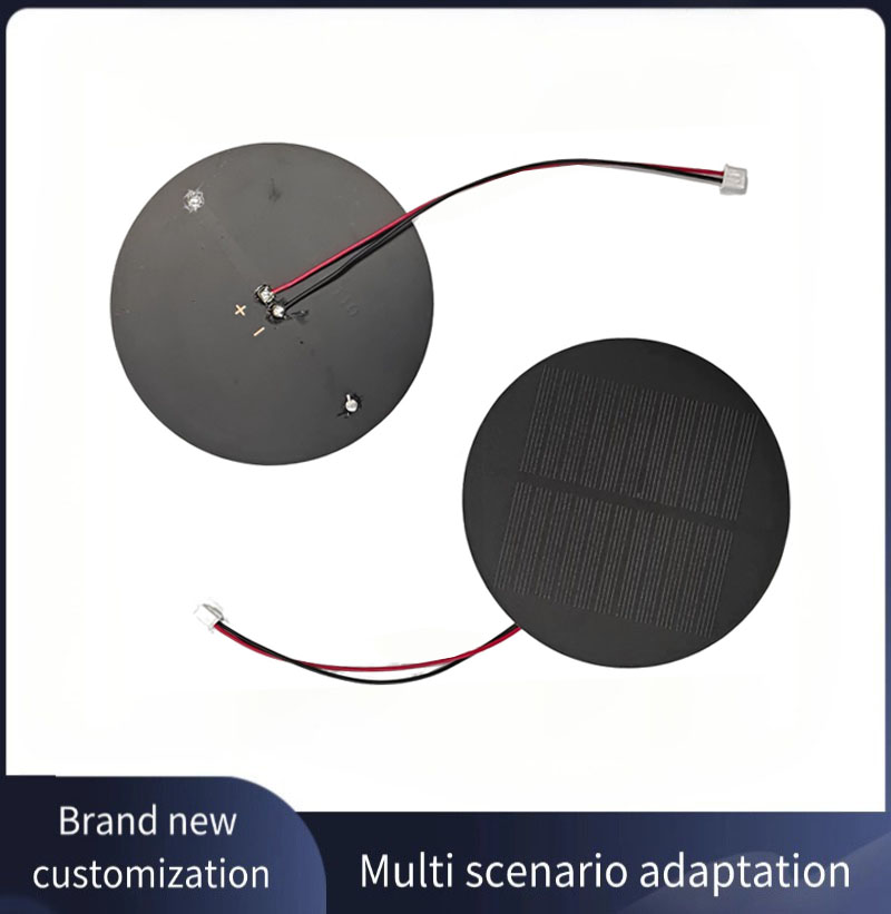 HX 1.5W customized round solar panel features a 110mm diameter design, utilizing high-efficiency PERC mono cells, a PET abrasive surface, and a PCB backsheet for both aesthetic appeal and durability.